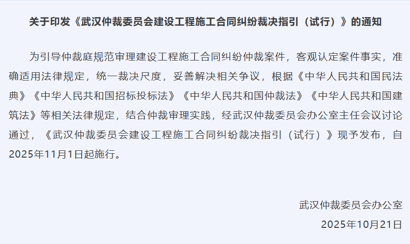 武汉仲裁委员会建设工程施工合同纠纷裁决指引(试行)正式发布!