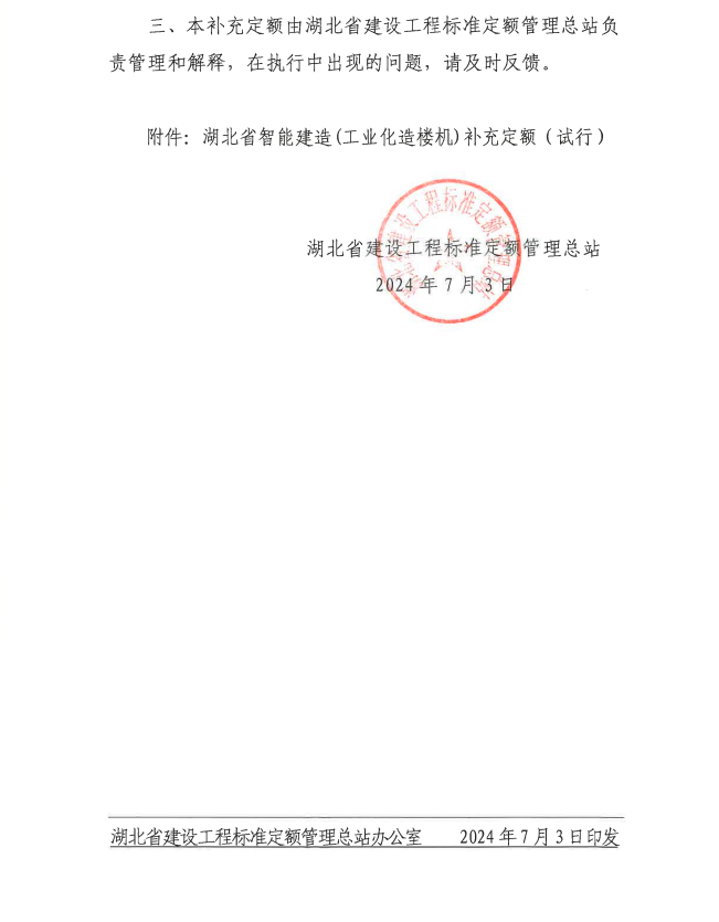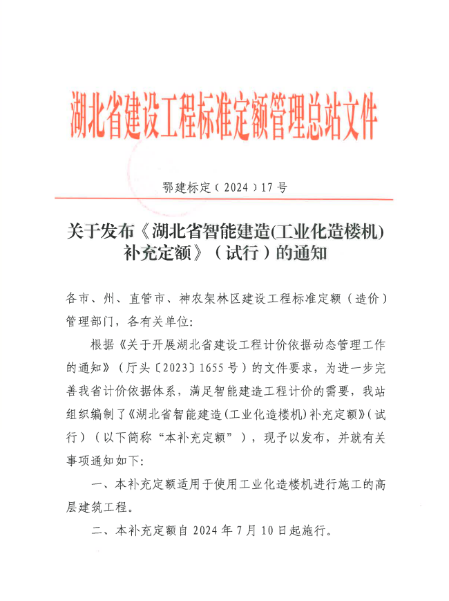 JZ2026-005、关于发布《湖北省智能建造(工业化造楼机)补充定额》(试行)的通知 (鄂建标定[2024]17号)