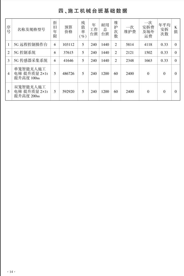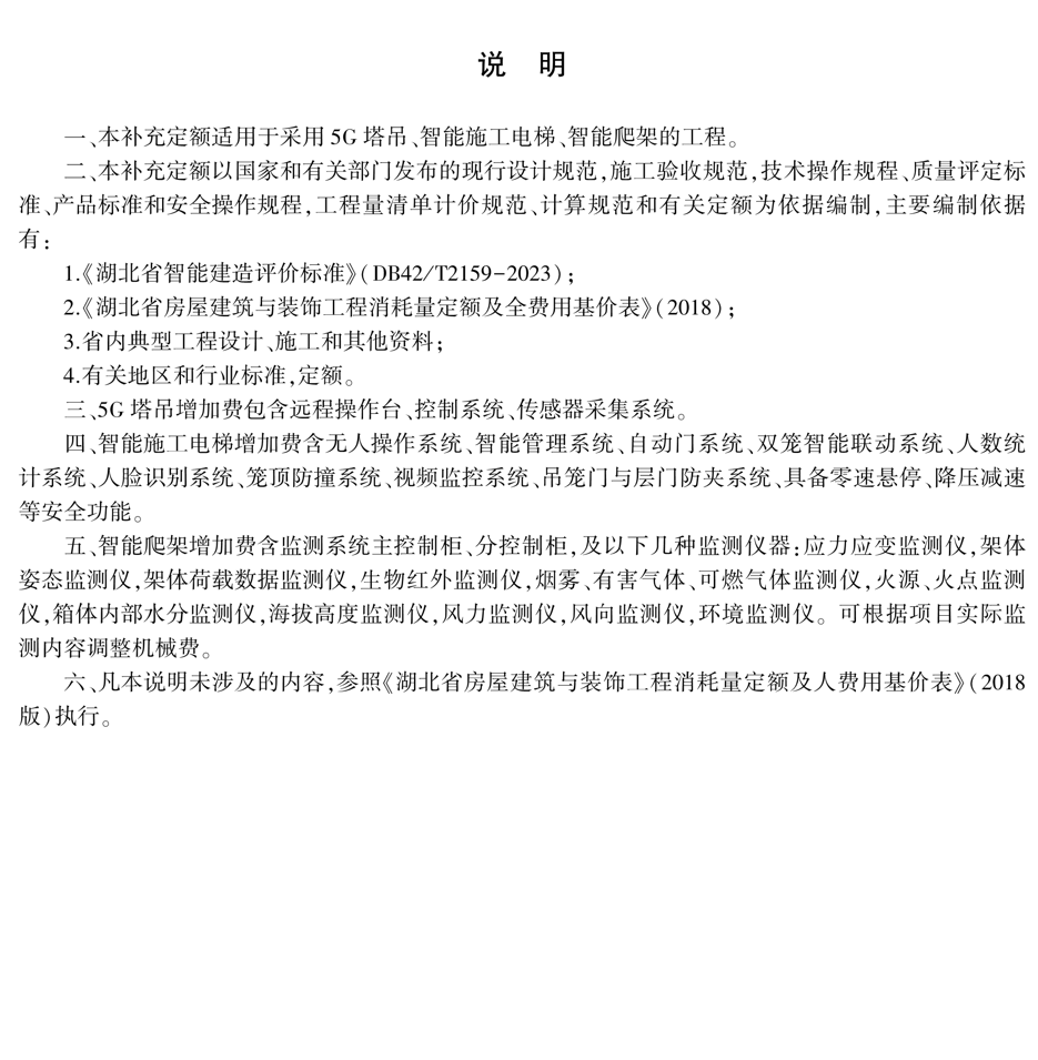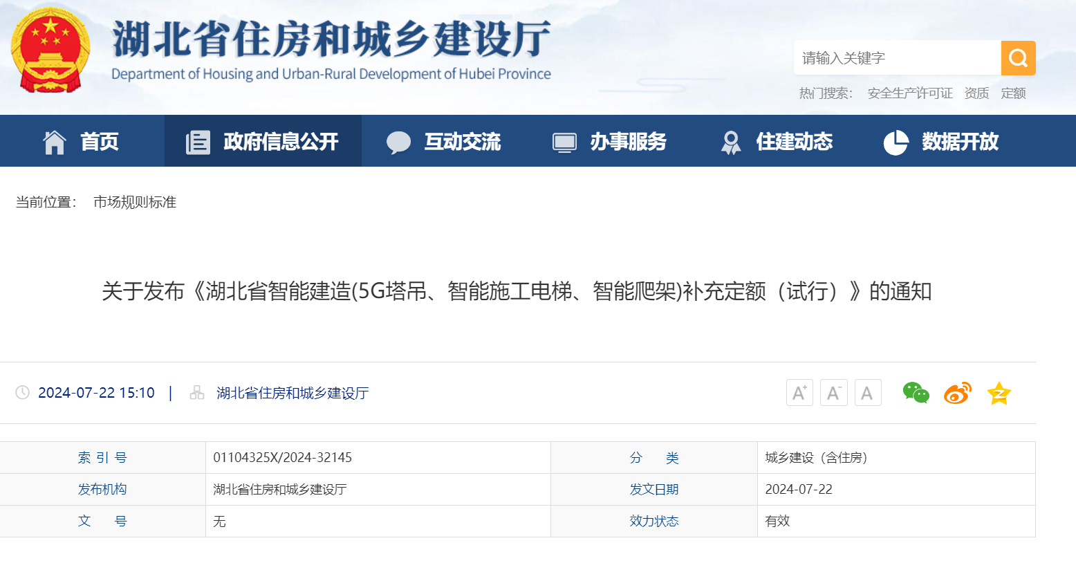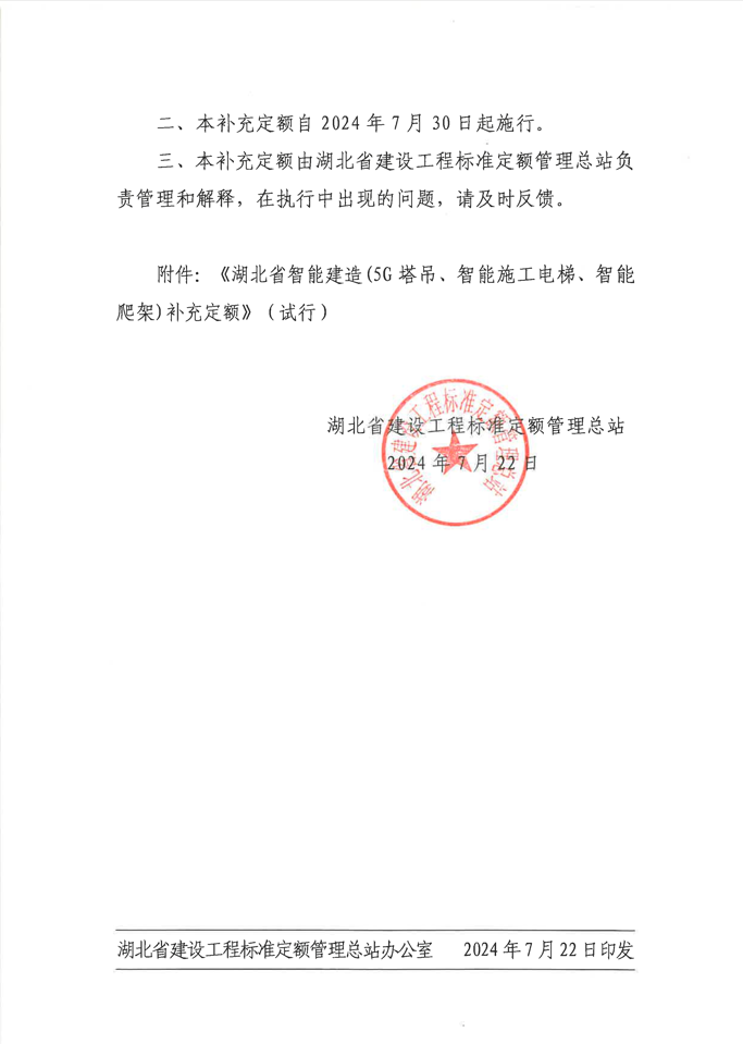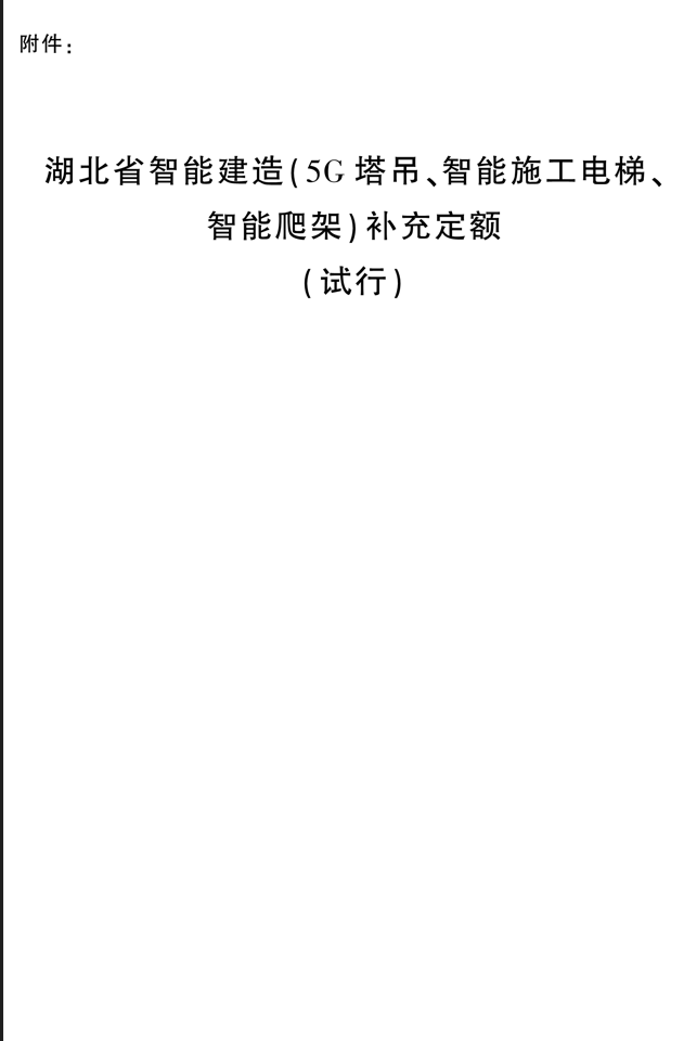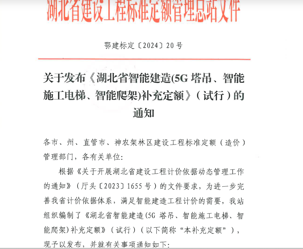 JZ2026-006、关于发布《湖北省智能建造(5G塔吊、智能施工电梯、智能爬架)补充定额(试行)》的通知(鄂建标定[2024]20号 2024-07-22发布)