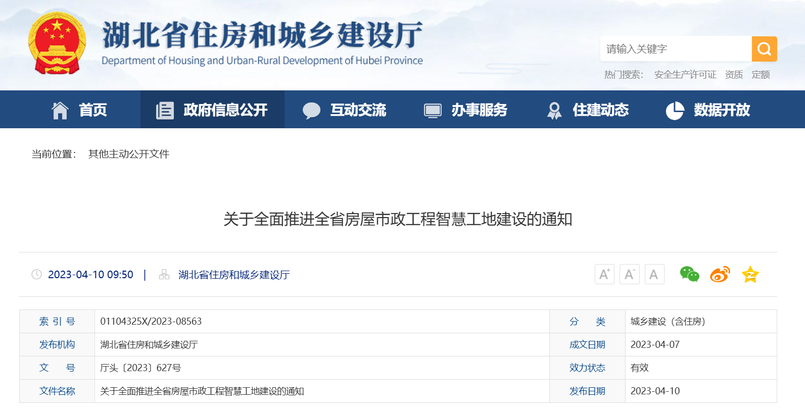 为深入贯彻落实《省人民政府关于全面推进数字湖北建设的意见》《湖北省数字住建行动计划(2021-2025年)》,数字赋能行业监管,全面推进我省房屋市政工程智慧工地建设,提高施工现场管理全过程数字化、精细化、智慧化水平,助推我省建筑业高质量发展。现就有关事项通知如下: