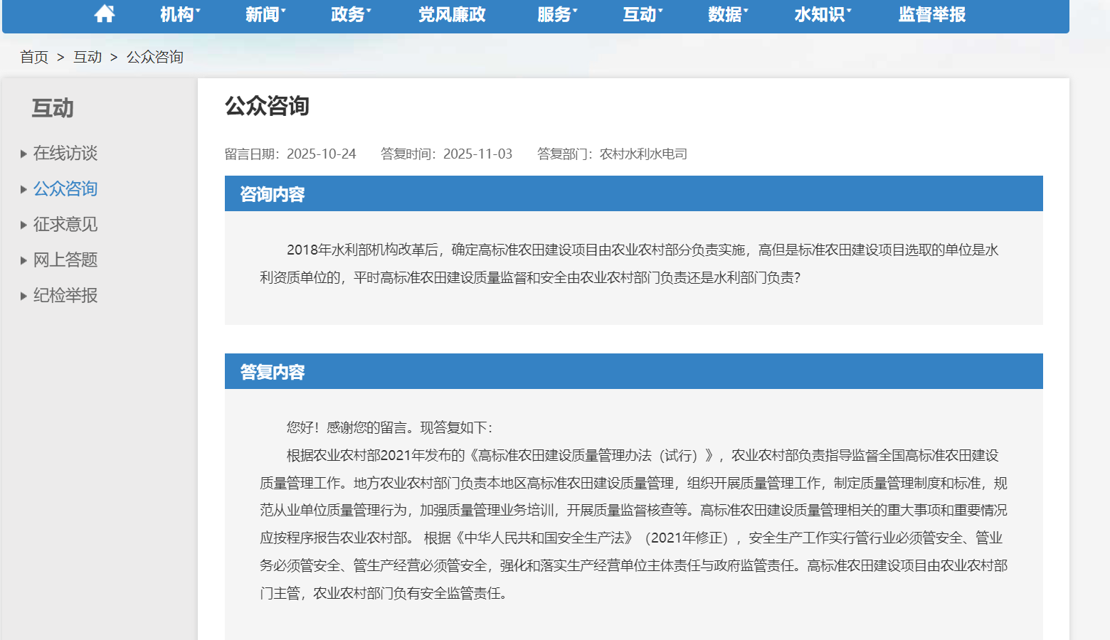 SL2026-003、高标准农田建设质量监督和安全由农业农村部门负责还是水利部门负责?(农村水利水电司 2025-11-03 )-水利电力土地水保-湖北小目标工程咨询有限公司